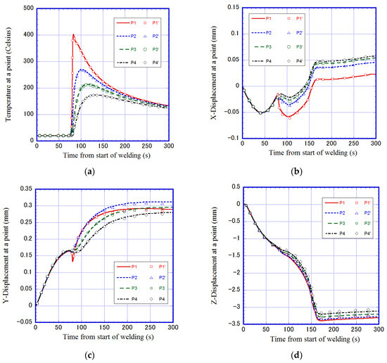 In addition, the transient displacements at the four points were measured to clarify the phenomenon during the welding and cooling, as shown in Figure 12b–d. In the case of longitudinal displacement, there were rapid changes in trend when the heating torch passed (t ≈ 80 s) and eventually left the plate (t = 160 s). This is because thermal expansion continues to accumulate in the welding direction during heating. And the contribution to X-displacement changed in the opposite direction when the heating torch traveled away from the point. This effect is much weaker in the Y and Z displacements, as reflected by the curves. For the nodal displacements in X, Y, and Z directions, the response of the model became smooth after the heat source moved off the plate, as can be observed in the three figures. The results from the analysis of the N-AMR (P1′~P4′) were in excellent agreement with that of C-FEM (P1~P4).
