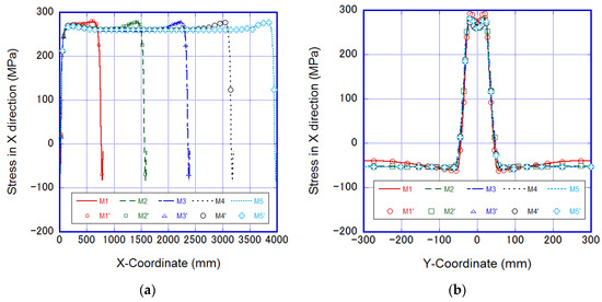 Residual stress in the X direction along two lines: (a) Line A. (b) Line B.