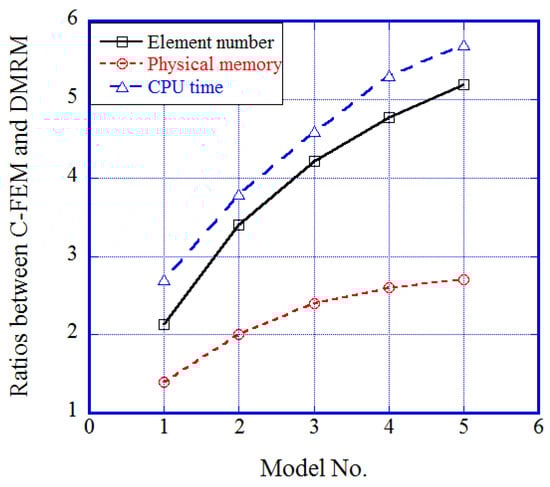 Ratios of element number, physical memory, and CPU time between C-FEM and N-AMR.