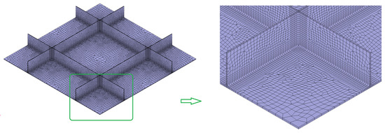 In the present study, a stiffened structure for the numerical study consists of a square plate with a thickness of 12 mm, and stiffening plates with a thickness of 8 mm, and detailed dimensions are shown in Figure 20. The stiffener–stiffener connections, which are termed cross-joints, are firstly welded via single-pass welding, and then panel–stiffener connections, which are termed T-joints, are welded via simultaneous welding on the two sides of each stiffener. For the two types of connections, the fillet size is all the same as 6 mm. Material properties for the base material and deposited material are assumed to have the same values as shown in Figure 10. The welding heat input for the cross-joint is 4000 W, and that for the T-joint is 3850 W. The welding speed is the same as 5 mm/s. A similar heat source modeling approach in Section 3 was employed to generate heat flux for the fillet region. The initial gap between stiffeners and panel plate is supposed to be negligible. After finishing each welding pass, the temperature of the whole structure is naturally cooled down to room temperature. To simplify the modeling, no external constraint was applied, and rigid body motion was fixed only. The initial coarse mesh of the structures is shown in Figure 21. The background mesh is constructed by 468,352 hexahedral elements and 582,197 nodes, and the total number of DOFs reaches 1,746,585.