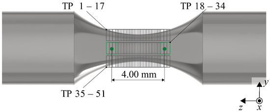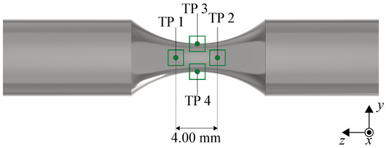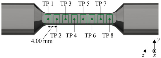 In the tensile tests, tracking points (TPs) along with the pattern tracking rectangles of the laser extensometer were distributed along the loading direction (see Figure 4) to enable a comparison of the results with those from Ressa [41] and a validation of the material model by means of simulations. For the latter, the stress-strain and the load-displacement curves were compared. Additionally, the distribution of the TPs was necessary because the necking location was not known in advance. The distance between the individual TPs served as a reference length to determine the strain and was set to 4 mm, as suggested by Ressa [41]. In contrast to the necking geometry, which could not be detected automatically, the distribution of the TPs allowed for an automatic measurement of the axial strain at the location of the necking. The locally increased axial strain due to the necking was automatically detected by the software (TestXpert III, ZwickRoell Group, Ulm, Germany).