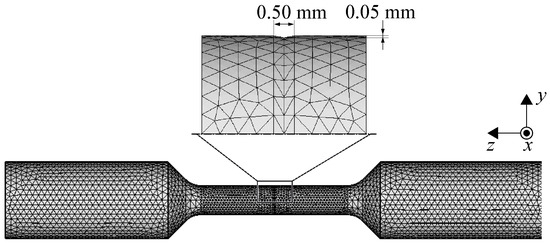 For the meshing of the specimen geometries, meshing software (Hypermesh 2019, Altair Engineering Inc., Troy, MI, USA) was used. Convergence studies conducted in the course of this study suggested an appropriate element size of 0.5 mm in the critical region where the necking and, therefore, high non-linearities in terms of geometry as well as material occur. Outside this area, the element size was increased to 1 mm to reduce the computational costs. Due to the described non-linearities and the risk of locking effects, quadratic tetrahedral elements C3D10 were utilized.