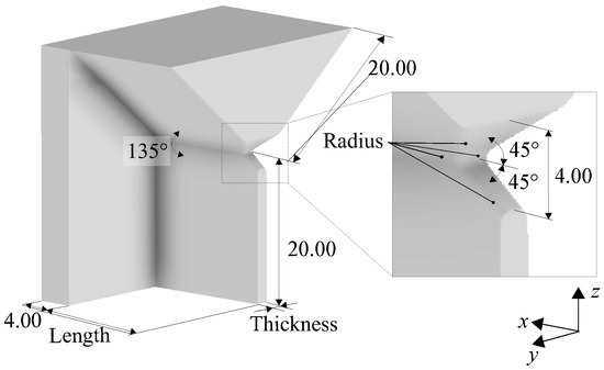 For Specimen 1 (see Figure A3a), the location of the necking could not be predicted in advance. To realize a controlled necking during the simulative tensile tests, an imperfection with a depth of 0.05 mm and a width of 0.5 mm was inserted onto the surface (see Figure 7). The location of the necking for Specimen 2, Specimen 2T, and Specimen 3 was known beforehand. These geometries were not adapted.