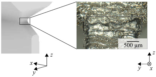 Crack initiation occurs in the center, with the mechanisms of void formation, growth, and coalescence leading to this coarse surface [50]. This area has been investigated with a Scanning Electron Microscope (SEM), (JSM-IT200 InTouchScope, JEOL Ltd., Tokyo, Japan), as shown in Figure A2b. The working distance was 12.6 mm and the acceleration voltage corresponded to 15.0 kV. The examined specimen showed the mentioned crater-like topology, which is a result of a pore formation due to inclusions and second phase particles. In addition, cracks were found, which originated from large pores (highlighted by the box), indicating a ductile fracture.