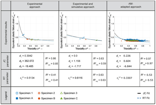 - The three calibration approaches show pronounced differences with regard to the fitting curves, which is especially the case for the JC model, suggesting differing predictive capabilities regarding cracking behavior;