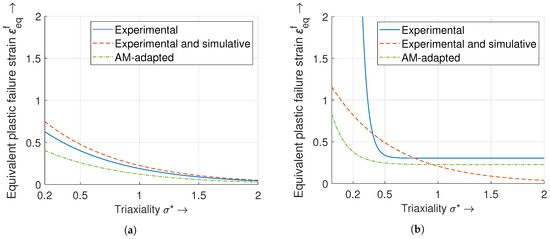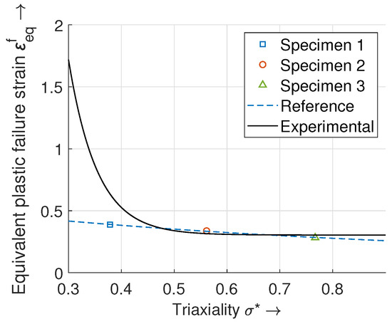 Both stress values, and , can be easily determined in structural simulations, which makes this approach particularly suitable for industrial applications. The stress triaxiality is a geometry-dependent parameter and a measure for the load acting on inclusions and second-phase particles, leading to a void formation. The goal of using this parameter is to determine an equivalent plastic failure strain as a function of , which provides information about the susceptibility to crack initiation.