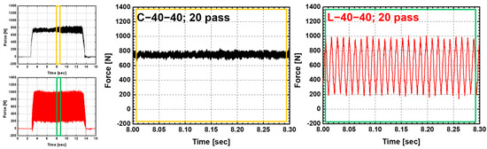 Figure 2 illustrates thrust force graphs for the L-40-40 and C-40-40 conditions, providing a visual representation of typical behavioral distinctions between the two cutting methods. As is evident in the graph, the thrust force in LF-VAD exhibits sinusoidal variation over time. To facilitate comparisons based on periodically changing values, RMS values were utilized for analysis instead of the mean value. Each RMS value was computed from a consistent intermediate segment of force variation (Vc40: 5 s, Vc80: 4 s, and Vc120: 2.5 s). This study conducted experiments under various conditions, encompassing different machining methods (CD and LF-VAD), diverse cutting speeds (40 m/s, 80 m/s, and 120 m/s), and varying cutting fluid pressures (10 bar and 40 bar). To systematically analyze these conditions, the thrust force analysis was divided into (1) maximum force and (2) RMS force analysis. The RMS force analysis section was further subdivided into (1) thrust force analysis based on cutting fluid pressure conditions and (2) thrust force analysis based on cutting speed.