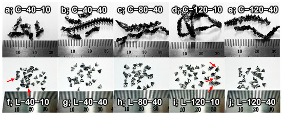 Figure 4f,i), chip segmentation occurred normally; however, due to insufficient cutting fluid pressure, elevated temperature, and adhesion wear, complete fragmentation did not occur. While numerical analysis is impeded by constraints in the machining process and chip collection (attributed to the cutting fluid), an observed phenomenon is the occasional inadequate cutting of chips, causing them to stick together more frequently. The phenomenon can be observed in