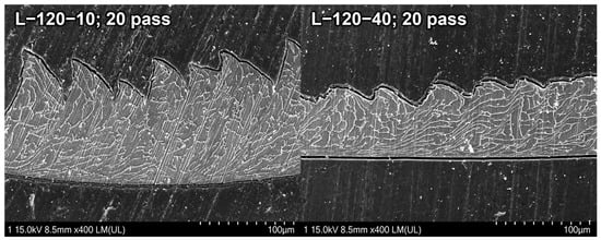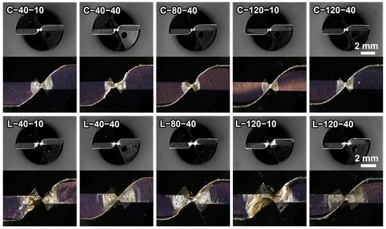 Figure 4, indicated by the red arrows for the L-40-10 and L-120-10 conditions. Conversely, in processes with a high cutting fluid pressure of 40 bar (
