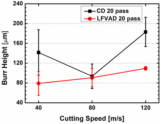 Figure 7 illustrates a graph depicting the variation in burr size based on cutting speed and machining processes. Detailed images of the measured results for burrs are presented in