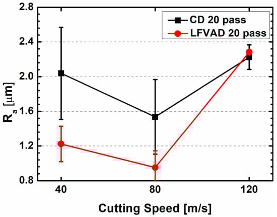 Figure 8 presents the variation in surface roughness with cutting speed and machining process. In addition, more detailed data on surface roughness measurements can be found in