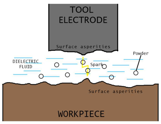 EDM is a machining method with several advantages over traditional methods, including the ability to manufacture hard-to-machine materials with high precision and an excellent surface finish [9]. As shown in Figure 1, it works by using sparks between a conductive workpiece and an electrode tool [9]. Through a series of electrical discharges between the workpiece and the electrode, while using a dielectric fluid, electrical energy is converted to thermal energy in electro-discharge machining (EDM) [10]. Additionally, with the introduction of a powder additive into the dielectric fluid, EDM can be enhanced to create powder-mixed micro-EDM. The introduced powder particles decrease the breakdown strength of the dielectric gap, allowing a conductive chain to form through the gap. This in turn increases the sparking frequency, which results in faster material erosion and increases the gap between the electrode and the workpiece [11].