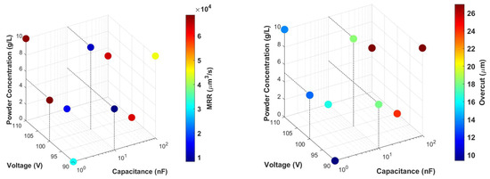 Plot showing how the MRR (left) and overcut (right) vary with different levels of capacitance, voltage, and powder concentration.