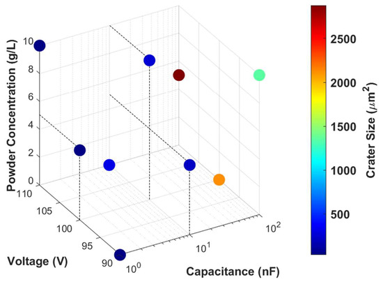 Plot showing how the crater size varies with different levels of capacitance, voltage, and powder concentration.