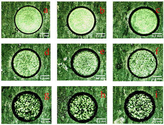Optical microscope captures of micro-EDM-treated Ti-6Al-4V holes using tungsten carbide electrode tool for different discharge energies: (a) 1 nF, 90 V; (b) 1 nF, 100 V; (c) 1 nF, 110 V; (d) 10 nF, 90 V; (e) 10 nF, 100 V; (f) 10 nF, 110 V; (g) 100 nF, 90 V; (h) 100 nF, 100 V; (i) 100 nF, 110 V at constant electrode rotational speed of 1000 rpm.