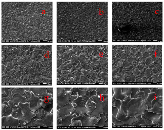 SEM captures for different discharge energies for micro-EDM of Ti-6Al-4V using tungsten carbide electrode tool: (a) 1 nF, 90 V; (b) 1 nF, 100 V; (c) 1 nF, 110 V; (d) 10 nF, 90 V; (e) 10 nF, 100 V; (f) 10 nF, 110 V; (g) 100 nF, 90 V; (h) 100 nF, 100 V; (i) 100 nF, 110 V at constant electrode rotational speed of 1000 rpm.