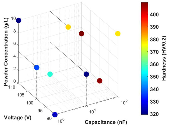 Plot showing how the hardness values varies with different levels of capacitance, voltage, and powder concentration.