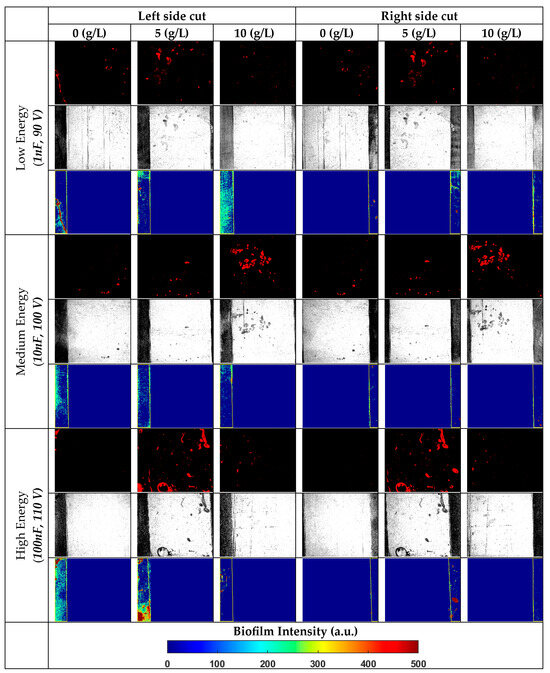 Figure 8 depicts images of crystal violet-stained, bright field, and detected biofilm developed by E. coli on a micro-EDM-treated Ti-6Al-4V alloy surface at different discharge energies and powder concentrations. The effects of discharge energy level and powder concentration on the amount of biofilm formed on the alloy for all bacterial strains are shown in Figure 9. It is worth noting that B. subtilis does not attach to either the untreated or treated alloy surfaces, and the amount of biofilm developed is less than 2% in all conditions studied. Figure 9 also indicated that the unmachined surface of Ti-6Al-4V alloy had a higher tendency for bacterial adherence than the machined surface for the remaining three bacterial strains. For example, Figure 9a–c clearly showed that the amount of biofilm coverage for P. aeruginosa and S. aureus significantly reduced for all applied discharge energies at 0 and 5 g/L hydroxyapatite powder concentrations. Figure 9c also shows that S. aureus biofilm formation increased due to low discharge energy at high powder concentrations of 10 g/L. For E. coli, the lowest levels of bacterial adherence were only seen at high discharge energies and high powder concentrations of 10 g/L.