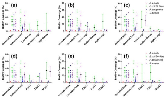 Quantification of biofilm coverage for all bacterial strains across all energy levels and powder concentrations. At powder concentrations of 0 g/L, 5 g/L, and 10 g/L, the effects of energy levels on biofilm coverage are shown in (a–c), respectively. The plots in (d–f) illustrate how powder concentration affects biofilm coverage at low, medium, and high energy levels.