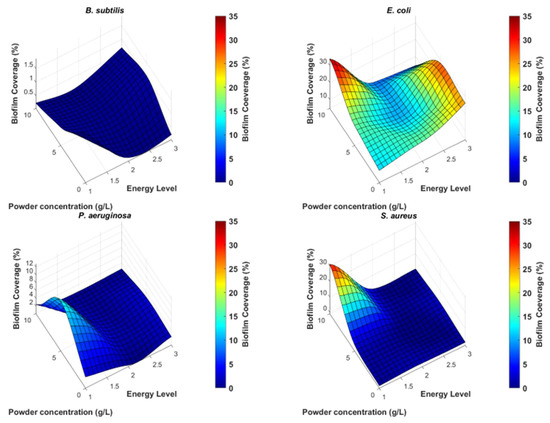 To comprehensively investigate the effects of discharge energies and hydroxyapatite powder concentrations on biofilm development, a surface map of biofilm coverage as a function of discharge energy and hydroxyapatite powder concentration was constructed for all bacterial strains, as shown in Figure 10. It is clear that the parameters for discharge energy and powder concentration significantly influenced bacterial adherence and biofilm development on the alloy surface. These surface plots clearly show that low bacterial adhesion for all bacterial strains tested in this work may be accomplished either by utilizing low discharge energy without powder or high discharge energy with high powder concentration. The results from this study demonstrate that the strength of bacterial attachment on the machined surface of Ti-6Al-4V alloy can be tuned by adjusting the discharge energy or the concentration of hydroxyapatite powder used. Thus, producing machined alloy surfaces with antibacterial properties for any required surface roughness and crater size is entirely feasible.