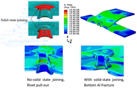 In addition to the load analysis during processing, the performance of the rivet during service should be investigated because the external load may result in rivet failure if the head is too thin. In order to confirm that the 1.0 mm rivet is strong enough to resist bending and shear, a performance model of cross-tension was developed to examine the stress concentration and failure mode. As shown in Figure 13, the F-SPR joint fails at the bottom Al sheet when solid-state joining is considered. On the other hand, if the joint is mechanically fastened only, the cross-tension joint will fail in rivet pull-out mode. In both cases, the rivet head remains strong enough, as only a small amount of plastic strain (<9%) has occurred at the rivet head. When solid-state joining is assumed at the rivet–Al interface, the joint will achieve a much-improved strength (5.25 kN compared with 3.5 kN) since the bottom Al material has to be fractured before the rivet can be pulled out. Solid-state joining between the rivet head and the top Al sheet will alleviate the stress concentration in the joint, which is helpful for reducing plastic strain in the rivet.