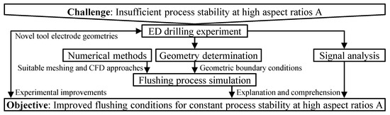 The aim of this study was to comprehensively investigate the influence of flushing conditions during ED drilling using tool electrodes with different internal and external geometries, as well as their interactions. The authors intended to address the research question of whether the improvements in process target parameters accomplished by several authors are actually due to the provision of additional space for the evacuation of debris and gas bubbles in the form of external flushing channels and what impact superimposed active flushing has. In comparison with the literature on similar topics, active flushing is not only considered but also given a special focus, as it promises further process improvements. Also, sophisticated transient numerical calculations are presented that go beyond steady-state results. From a numerical point of view, no holistically generated insights are available. Existing publications on this topic by the same authors will be considerably extended by much more detailed explanations of the numerical modeling approaches, with the objective of enabling accurate comprehensibility and reproducibility, as well as by a considerably improved and more elaborate discussion of the signal analyses [11,12,13,14]. The fluid mechanical phenomena in the working gap, the effects on the process target parameters and the process stability with increasing machining depth were analyzed. Figure 1 illustrates the overall investigation approach to maintain the process stability at high aspect ratios due to improved flushing conditions.