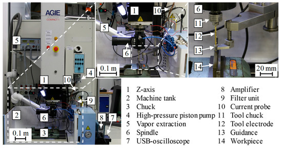 For the purpose of machining blind holes to a machining depth of dm = 15 mm and with a process-dependent hole diameter of dh > 3 mm, the die-sinking machine tool AGIETRON compact 1 from GF Machining Solutions, Losone, Switzerland, was used, offering a generator that is capable of generating both transistor and resistance–capacitance (RC)-type pulses (Figure 2). The process parameters given in Table 1 were selected based on preliminary experiments with capacitor discharges. The latter generally not only allows for very low discharge energies We ≤ 0.1 µJ in micro-EDM but also enables levels of the discharge current ie that exceed those of static discharges on the same machine tool. The spindle that enabled rotation was the Jet Injektion-H.S.2000 from Schleinkofer GmbH, Rödermark, Germany, allowing for a rotational speed 0 min−1 ≤ n ≤ 2000 min−1 with an age-related run-out error of er ≤ 0.016 mm.