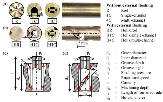 Tool electrodes used for the ED drilling experiments: (a) without external flushing channel; (b) with external flushing channel; (c) schematic of conventional flushing with internal flushing; (d) schematic of flushing with additional external flushing channel.