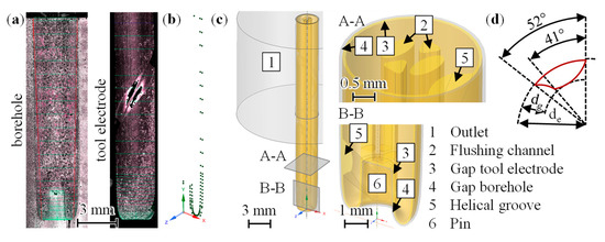 Tool electrodes with external flushing channels were also successfully used in ECM, where electrolysis was used as the fundamental working principle [10]. The renewal of the electrolyte is critical for improving the process stability and dissolution rate and reducing form defects at high aspect ratios [43]. Increasing the rotational speed of the rotating helical tool electrode had a reducing effect on the working gap in both electrochemical micro-drilling [12] and electrochemical contouring, allowing for precise manufacturing of gap contours in quartz glass with an aspect ratio of A = 6.8 [43] and complex structures in steel 1.4301 [42]. Studies by Tsui et al. showed that the use of helical electrodes resulted in a significant reduction in the hole conicity by 42.4% compared with conventional cylindrical electrodes [40]. Hung et al. were able to achieve a significant reduction in the hole diameter by 45.6% using helical tool electrodes with insulating layers of epoxy and ceramic [41]. Supposedly as the first, Hung et al. specifically investigated the influence of helical external geometries on the process target parameters of a material removal process, in this case, a hybrid process of ED drilling and ultrasonic-assisted ED sinking. Using specially manufactured helical tungsten carbide tool electrodes, they were able to manufacture holes with a maximum aspect ratio of A = 10, achieving a reduction in machining time, working gap and roughness characteristics [44].