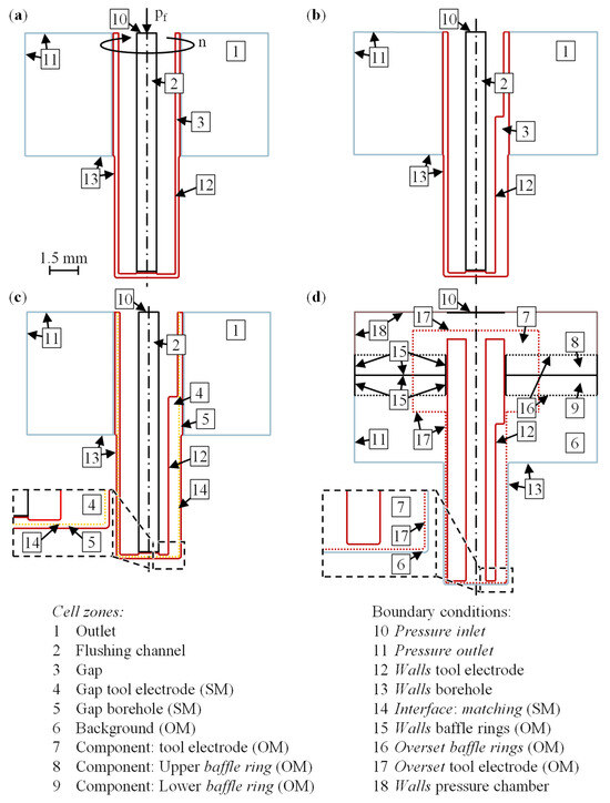 The overset mesh (OM) approach has the advantage of allowing for arbitrary movements of the component meshes on the background mesh and, therefore, translation movements of the tool electrode are possible. This is visualized in Figure 5c and involves additional boundary conditions. The background and component geometries have to be designed and meshed independently. Merging of those overset regions happens during the initialization of the flow field within the setup and is not only highly complex and numerically expensive but also subject to numerous and strict requirements [85]: