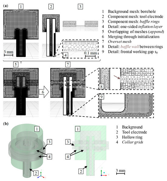 The specific third requirement for the donor search motivates the first objective concerning the inflation layer analyses below Table 2. The OM approach was already introduced for CFD simulations in the field of ED drilling without internal flushing, also providing detailed visual insights into modeling, meshing and merging [14]. In addition, Figure 7a shows the overset mesh for the present case with internal flushing, which was generated with the procedure described above and on the basis of Figure 5d. The working gap was successfully resolved with a number of cells of NC = 18, which was divided into NV = 6 volume cells between the two inflation layers. The little detail of an inlet, which could not be placed at the boundary of the mesh (see the first OM requirement), led to the necessity of adding some kind of pressure chamber domain around the tool electrode’s top pressure inlet and sealing this chamber on the outside walls of the tool electrode to prevent perpendicular bypass fluid flows. This fact resulted in many additional geometries for the implementation of baffle walls (Figure 7a) or collar grids (Figure 7b), which, in turn, caused the heavy occurrence of orphan cells and, therefore, diverging solutions. These additional geometries were also multiplied by additional auxiliary bodies, namely, the bodies of influence, for the purpose of local mesh refinements because the latter cannot be set up by the cell sizes inside the cell zones in the case of the OM approach. The idea of applying a hollow ring instead of the two baffle rings holds the advantage of generating more dead cells and, therefore, reducing the numerical effort. Nevertheless, additional components with respective meshes have to be generated and increase the complexity, not only for the user but also for the merging algorithm. During initialization, the flood filling of dead cells in areas where no fluid is supposed to be starts with placing seed cells. Complexities in the topology or mesh resolution issues can cause the algorithm to unintentionally identify seed cells inside fluid regions and end up marking entire fluid regions or cell zones as dead. Different variants and arrangements of component meshes led to incorrectly identified seed cells and, as a consequence, dead regions, which is why the approach of using baffle walls is preferred.