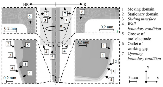 Numerical model, exemplary for the type R and HR tool electrodes, with details of the mesh and the sliding mesh approach.