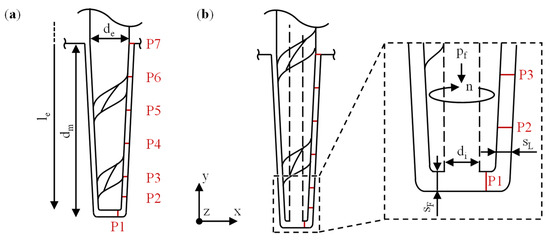 Schematic sketches of the rod and single-channel geometries are illustrated in Figure 9, which also details positions P1 to P7 for later evaluations. The multi-channel geometries are equivalent to Figure 9b, except for the internal channels. The geometrical and physical parameters of all fluid flow simulations are consistent with the experiments and correspond to an aspect ratio of A = 5.