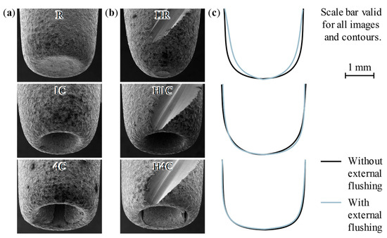 Then, in order to accurately simulate the internal and external flushing process, it was obligatory to determine the final tool and workpiece geometries subsequent to the ED drilling experiments. By cutting the bores in half using wire EDM and measuring the contour polygons of the bores and the associated tool electrodes using an InfiniteFocus G4 digital microscope from Alicona Imaging GmbH, Raaba, Austria, it was possible to design a digital representation of the tool and workpiece geometries and, therefore, gain the geometric boundary conditions after the ED drilling experiments for the six types of tool electrodes defined in Figure 3a,b. Figure 4 visualizes this sequence of the geometry determination. In Figure 4c, the sliding mesh approach, which split the working gap in two, is shown and is explained in the following section.