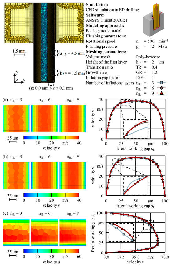 The most accurate and effective meshing approach and respective CFD setup were identified by means of the generic models described here (see upcoming Section 4.2). Using the resulting recommendations and the realistic geometric boundary conditions obtained as described in the previous Section 3.2, the fluid flow in the working gap was simulated on those realistic, greater domains, as introduced in the following Section 3.4. The numerical results gained with these sophisticated models of all six tool electrode types finally allowed for deriving analogies to the experimental results of Section 4.1.