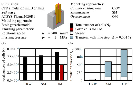 Generally, numerical simulations, especially fluid mechanical analyses using CFD, have contributed to improving the understanding of the phenomena in the working gap. The increased possibilities in terms of available hardware and modeling approaches have made a decisive contribution to this. The extremely fast physical processes in the working gap, the severely limited optical accessibility due to the very small dimensions, and challenges with flow visualization make CFD an indispensable tool and is especially helpful for the investigation of multi-phase interactions, as well as for compressible phenomena, like in the case of dry-ED milling or drilling [44,47,48].