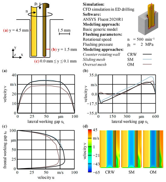 The counter-rotating wall (CRW) approach shown in Figure 5b is the simplest way to model the rotation of the asymmetric tool electrode geometry. This approach works based on the assumption of a change in the reference position, originating from the stationary workpiece to the rotating tool electrode. As seen from this moving reference point, the tool electrode is at rest and the wall of the workpiece electrode moves in the direction opposite to the actual direction of rotation. The volume forces on the fluid are generated by the rotation of the whole fluid domain or cell zone respectively by applying frame motion on the cell zone ‘gap’ with a rotational speed of n = 500 min−1 (see Figure 5). The walls of the ‘electrode’ are walls moving relative to an adjacent cell zone, whereas the walls of the ‘borehole’ are absolute moving walls, both with a rotational speed of n = 0 min−1. The difference between these definitions becomes apparent when the proximity to a stationary or rotating cell zone is considered. The aforementioned relative specification implies a resting wall in the moving reference frame and, at the same time, a moving wall in the absolute reference frame. The absolute specification means that the wall rests in the absolute reference frame and moves in the opposite direction in the moving reference frame. Frame motion only allows for capturing steady-state flow phenomena within the CRW approach. The steady-state solution is reached after a number of iterations of nI = 1000 iterations. A transient calculation would need a mesh motion or dynamic mesh approach instead and a respective interface to the stationary domain. This is exactly what a sliding mesh offers.