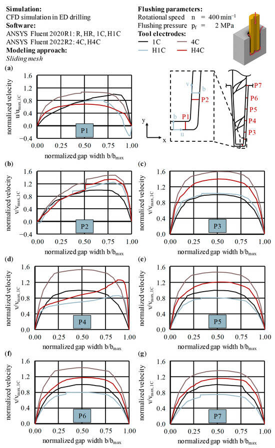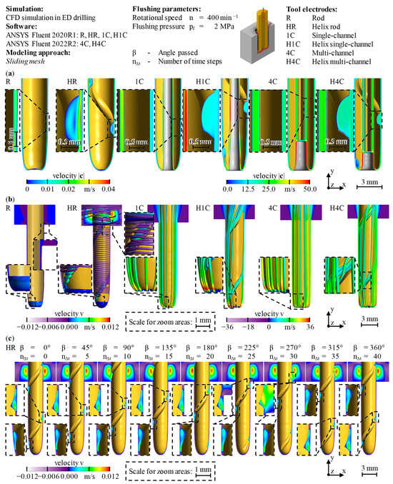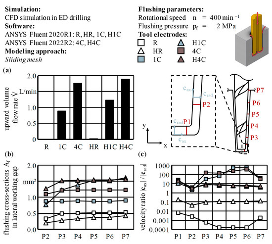 Following a state-of-the-art discussion in Section 2 and a detailed description of the materials and methods in Section 3, this paper presents the processing results of the ED drilling in Section 4.1, as well as corresponding numerical results of the fluid flow field for novel tool electrode geometries based on the standard tool rod (R), single-channel (1C) and multi-channel (4C) electrodes without and with a helical external flushing channel (prefix H, i.e., HR, H1C and H4C). In this way, commonly used tool electrode types, like 1C and 4C, can serve as references. In Section 4.2, a generic, numerical computational fluid dynamics (CFD) model created with ANSYS Fluent 2020R1 from ANSYS Inc., Canonsburg, PA, USA, with sufficient complexity was used to compare different meshing techniques and to find the trade-off between the mesh resolution and the accuracy of the solution. A complex 3D CFD model was developed on the basis of these findings to enable detailed numerical investigations of the fluid flow within the working gap in general and an evaluation of the external flushing channel’s influence on the flow field in particular in Section 4.3. This was done for all six types of tool electrodes with and without internal and external flushing channels, respectively. In addition, signal analyses of the gap voltage u and current i are used for evaluation in Section 4.4, utilizing a signal analysis system combining sophisticated measurement hardware and a Raspberry Pi 4 single-board computer from the Raspberry Pi Foundation, Cambridge, UK [15]. Performance-enhancing algorithms for the event classification using vector calculations, multithreading and multiprocessing techniques enabled a substantial reduction in the runtime and are also presented. Finally, the Supplementary Materials not only contain detailed experimental and numerical data of this work but also additional flow visualizations in the form of transient multi-phase CFD simulation animations.