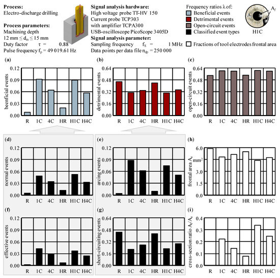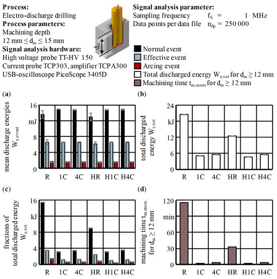 Electrical discharge machining (EDM) is an established manufacturing process for machining metal and electrically conductive ceramic materials. It enables the manufacturing of precise holes with high surface quality and small tolerances, independent of the hardness and strength of the material. However, in addition to the physical limitation of the minimum electrical conductivity of σ > 0.01 S/cm of the material [1] (p. 3), the production of high aspect ratios, which refer to the ratio of machining depth dm to hole diameter dh, is a limiting factor in electro-discharge (ED) drilling [2]. With the decreasing diameter of the tool electrode, the maximum achievable aspect ratio of the hole and the material removal rate (MRR) decrease and the electrode wear rate (EWR) increases [3,4,5]. This is caused by the deterioration of the process conditions in the working gap between the electrodes with increasing machining depth since removed particles can no longer be efficiently evacuated [6,7]. Today, it is generally agreed that the EWR is primarily associated with the material properties. However, both the EWR and the MRR result from overlapping discharge crater geometries and increase with an increased discharge energy We [8]. The latter is generally influenced by the generator that acts as a source of charge carriers and its main parameters, which depend on the generator type. More theoretically, at the micro level, the system of tool and workpiece electrode and dielectric fluid can be interpreted as a capacitor. Its energy depends on the capacity and voltage applied, resulting in an electric field strength that influences the energy density in a quadratic manner or the surface charge density in a linear manner, respectively [9]. This is why one can say that the process target parameters of MRR and EWR are directly connected to the process parameters of open-circuit voltage ûi and discharge capacity Ce by means of the surface charge density σS. Other process parameters, such as the charge current iL and the pulse duration ti or the pulse interval time t0, instead affect the charging process of the capacitor or the time interval available for flushing. Apart from the electrical parameters and the charge carrier source, the dielectric itself also contributes to increasing the energy density by constricting the discharge channel [10].