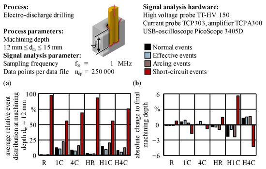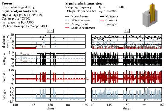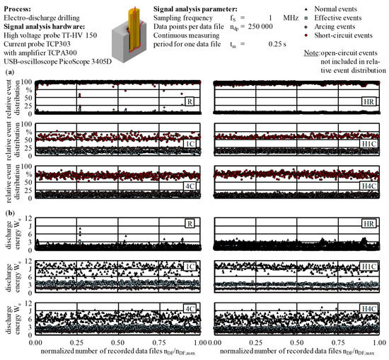 For the purpose of closing the gap between the averaged results from ED drilling experiments and insights into the fluid mechanic processes within the working gap using sophisticated CFD simulations, the analysis of voltage and current signals over the entire machining depth of a borehole is a well-established method. Experimentally validated CFD models allow researchers to match directions or absolute values of physical properties, like the velocity, the fluid flow or turbulence characteristics, from the local or global flow field with process target parameters, which are typically single, averaged values representing a specific case based on three experiments for statistical validation. These kinds of process target parameters, like the MRR or EWR, are strongly affected by the type of appearing discharges [67]. In addition to the process-averaged quantities, signal analyses possess a temporal component since measurements, and thus, event classifications are possible over the entire machining depth or parts of it. This allows for online control, as well as global and time-dependent evaluations of the process stability to be made [67,68]. Dauw et al. already developed a pulse discriminator, not just for the basic four pulse type classification of normal sparks, short circuits, arcs and open circuits but also for the subdivision of fifteen pulse types, e.g., ignition-delay-free discharges or less effective normal spark discharges [67]. Other authors used thresholds [15,69,70,71,72,73,74], discharge-energy-based approaches [68,75] or field programmable gate arrays (FPGAs) for real-time signal processing [76,77]. Nirala and Saha observed the distribution of energy in micro-ED drilling while studying online responses, such as the pulse frequency and the pulse type density, as well as offline responses, such as the MRR or volume removal per discharge. They defined the share of effective discharges in the removal as the discharge energy and state where the effective discharges have 50% of the discharge energy of the normal discharges. Therefore, they defined the number of effective discharges as the number of normals plus half of the number of effectives and noted that the number of effective discharges increases, whereas the number of normals decreases with the drilling depth [69] (p. 11). The evaluation of the process stability is determined by the decrease in volume per discharge over the drilling depth [69] (p. 15). Yeo et al. applied a similar approach, also for micro-EDM signals based on RC generators, but used the fixed pulse cycle time as one discrimination parameter and counted the number of current peaks in it to distinguish between short circuits and groups of arcs. The comparison of the peak current enabled them to detect normal and delayed discharges [73]. Chu et al. used FPGA logical circuits with adjustable thresholds for the discrimination of normal, short-circuit and open-circuit pulses, and finally improved the machining efficiency and the feed rate stability in wire EDM [78]. The same authors later used this classification method to evaluate the discharge statistics during the visual observation of ED drilling on an inclined surface [79]. Amongst others, Schneider investigated the energy input in the continuous erosion process and, therefore, also applied an FPGA-based real-time signal processing that was originally developed by Schwade and later evolved for the realization of online process monitoring by Küpper et al. [76,77,80,81].