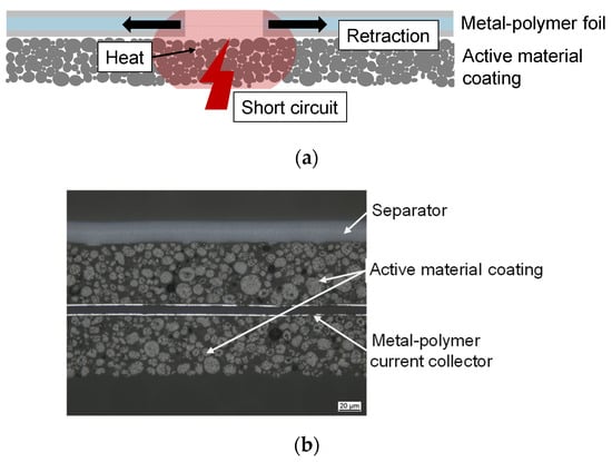(a) Principle of metal–polymer current collectors (inspired by [17]) and (b) metal–polymer current collector in a laminated cathode.