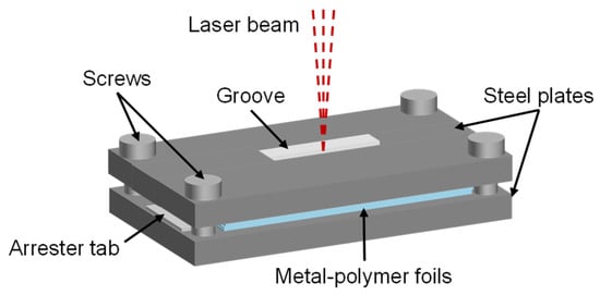 The focus for laser welding was set on the surface of the foil stack. For this purpose, 10 foils were clamped together with an arrester tab underneath to achieve a zero gap, as shown in Figure 3. The weld length was set to be 10 mm at a scan speed of 10 mm/s. An AXIALSCAN-30-Y scanner (RAYLASE AG, Wessling, Germany) was used for this purpose. The laser power was varied between 10 W and 200 W. REMARK: It should be noted that it is not possible to achieve a welded joint due to the material properties of the metal–polymer current collectors (further details in Section 3.2).
