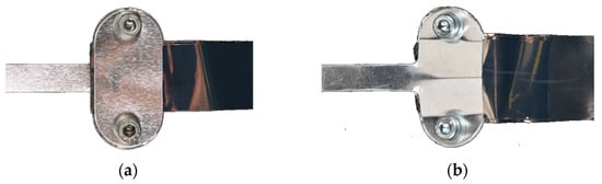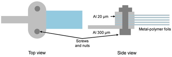 However, since the clamp could not contact all of the foils, 20 µm aluminum contact aids were alternatively stacked with the metal–polymer current collectors. Clamping was performed using two M4 stainless steel bolts and nuts with a torque of 3 Nm. The resulting joint is illustrated in Figure 5.