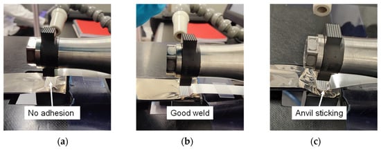 Visual assessment of ultrasonically welded joints: (a) no joint achieved (under weld), (b) good joint achieved/good weld, and (c) anvil sticking and damage of foils (over weld).