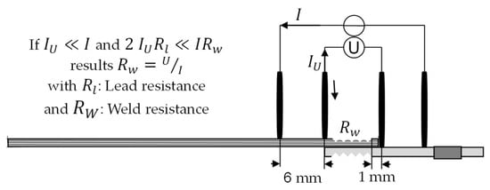 To measure the electrical resistance of the joints (weld resistance), four-point probe measurements were conducted using a Resistomat 2329 from Burster GmbH & Co. KG (Gernsbach, Germany). The inner probes were positioned one millimeter from the joint on the foil or tab to measure the voltage potential. The outer probes were placed 6 mm away from the inner probes (see Figure 7). The electrical resistance was then calculated as the quotient of the voltage difference between the inner probes and the current flowing through the outer probes. This method eliminates the influence of lead and contact resistances. The resolution was 10 µΩ.