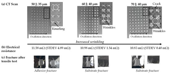 The CT images of the specimens reveal that, with increasing welding energy and amplitude, the wrinkles between the horn tips increase sharply until cracks appear in individual foils at the maximum welding parameters. However, the four-point measurements show only minor differences in electrical resistance (Figure 8b), with a tendency toward slightly decreasing resistances and lower standard deviations with increasing welding parameters. The fracture pattern of the tensile tests show that adhesive fracture occurs for the specimens that were welded with the lowest energy input. In contrast, a substrate fracture appears when the energy input is increased. In the subsequent examinations, the welding parameters were always optimized for substrate fracture without over-welding taking place.
