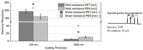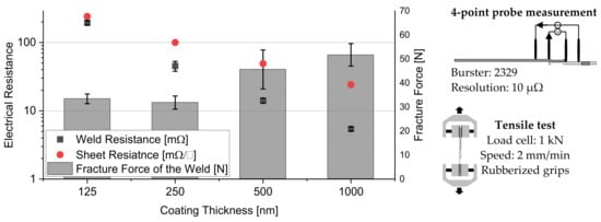 To assess the influence of the coating thickness on the weld properties, four of the metal–polymer current collectors were joined with a 200 µm tab. The foils used were coated with copper on both sides. Copper coating thicknesses between 125 nm and 1000 nm were considered. A 12 µm PET (V2) was used as the polymer substrate. The results of the mechanical tests as well as the resistance measurements are presented in Figure 9.