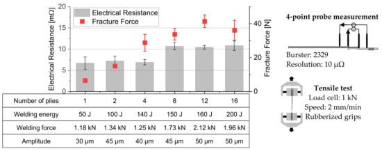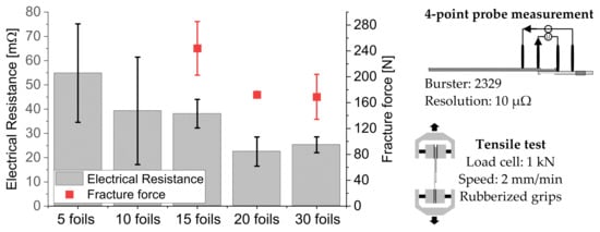 Impact of the number of foils welded with optimized parameters on the electrical resistance and fracture force of the welds.