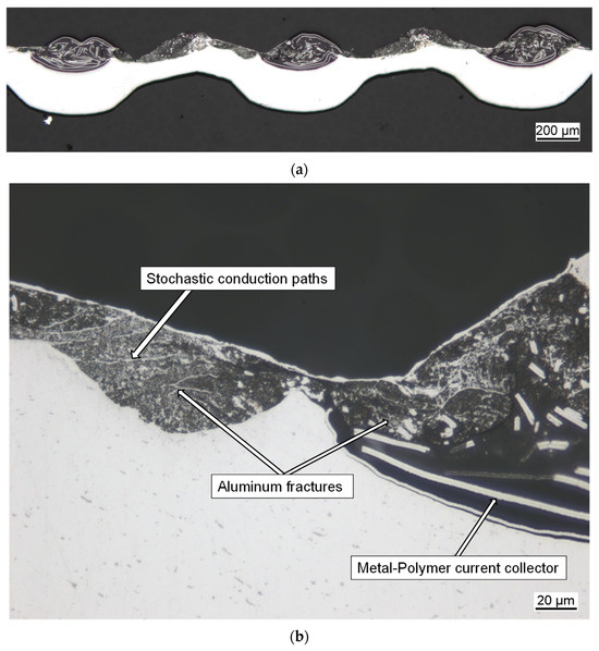 Based on these findings, it can be stated that the potential for contacting metal–polymer collectors using ultrasonic welding is limited by both the high electrical resistance of the weld and the restricted number of weldable foils. Furthermore, the joint’s resistance to aging under the extreme conditions within a cell is not certain. The differing thermal expansion coefficients of aluminum and PET can induce critical mechanical stresses within the cell. This expansion can also disrupt electrically conductive paths, thereby increasing the electrical resistance. These factors, along with the chemical exposure of PET to the electrolyte, could negate the benefits of metal–polymer current collectors [40,41].