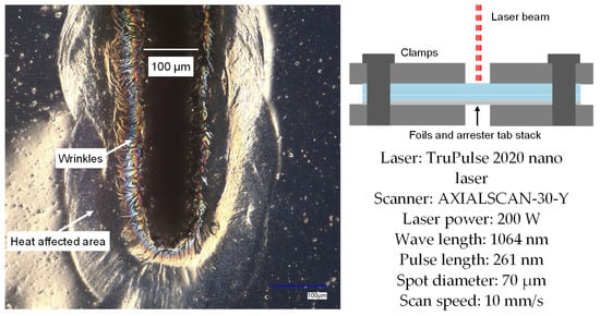 Laser beam welding tests were conducted using the Al@PET foil (V1). It is important to note that no welding was achieved. Light microscope images reveal a strong formation of soot on the foils and a retraction of the foils from the laser beam area. This is evidenced by wrinkles at the edges. Additionally, the width of the cut caused by the foil retraction is approximately 100 µm, which is considerably larger than the laser beam spot diameter (70 µm) (see Figure 13). Furthermore, the heat input from the laser beam results in a large heat-affected zone, distinguishable due to the wrinkling and retraction of the foil in this area. This begins to occur at temperatures around 110 °C, at which point the foil starts to shrink. In this regard, the metal–polymer foil fulfills its function of retracting at elevated temperatures, which has a detrimental effect during fusion welding and thus renders it unsuitable for laser welding.